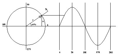 De pijl draait linksom, tegen de klok in. Als we de hoogte van de pijl uitzetten tegen de hoek (= tijd) dan ontstaat de sinus vorm.